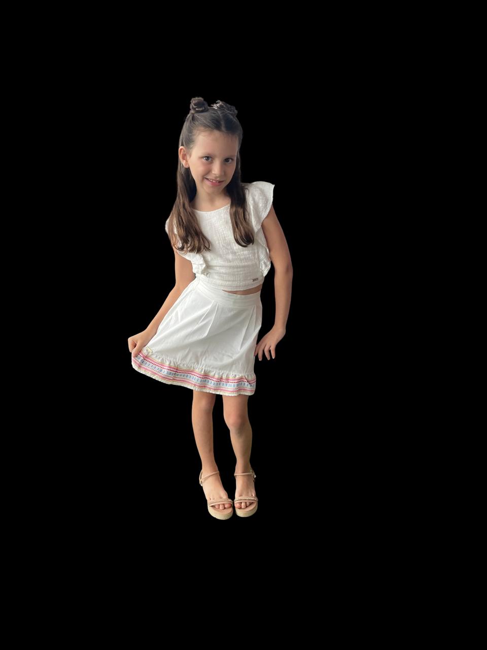 Saia em tricoline antiviral, rodada com elástico na parte posterior da cintura e detalhe em bordado colorido na barra.
