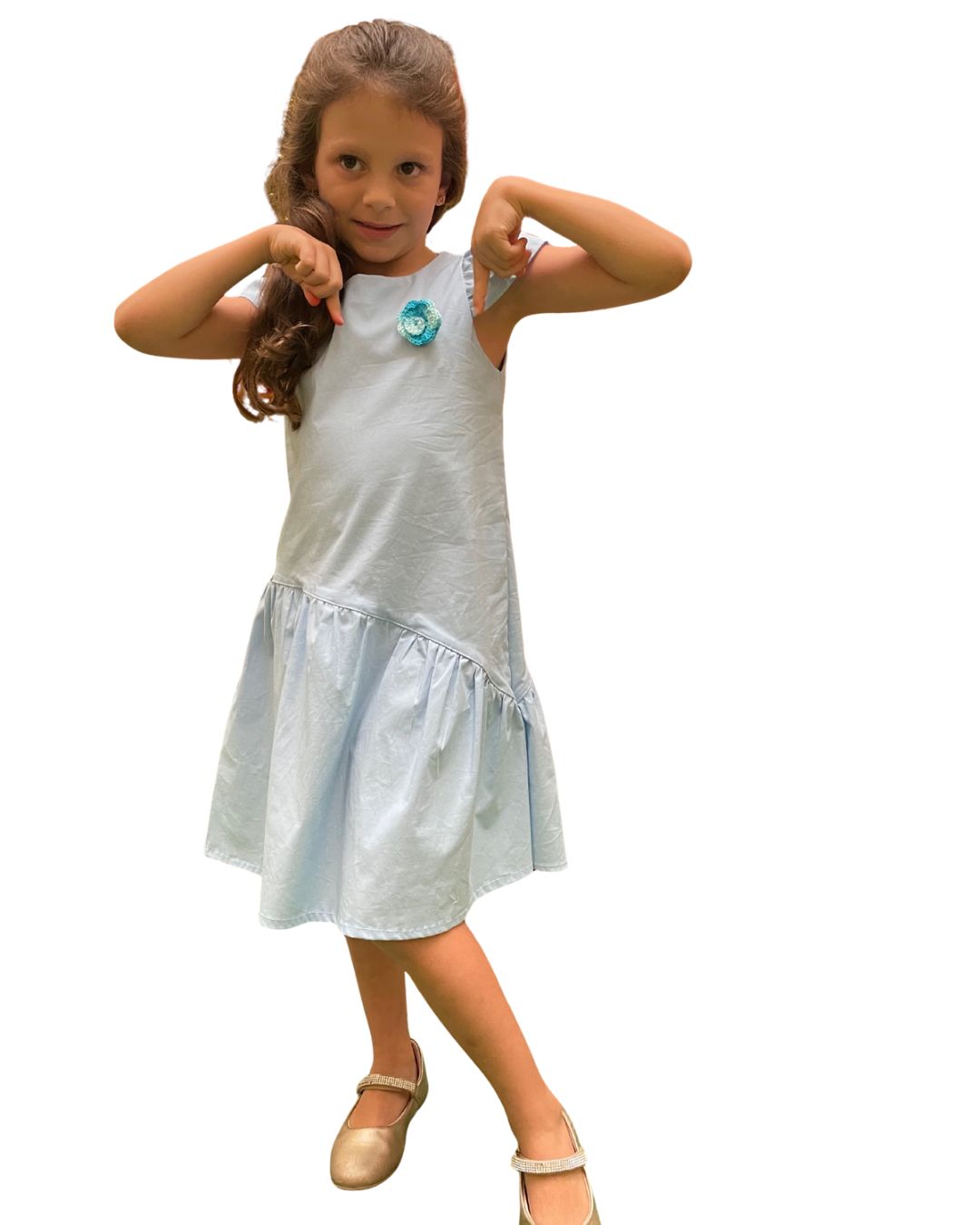 Vestido manga curta com cós assimétrico e cintura baixa, fechamento botão, flor decorativa em tricô.